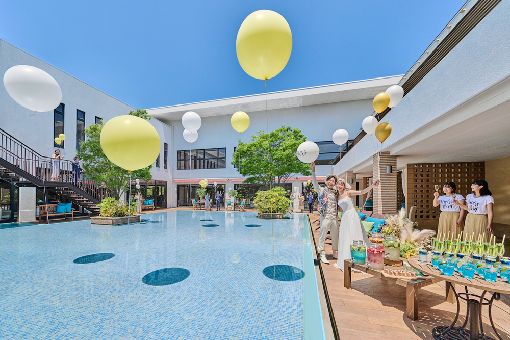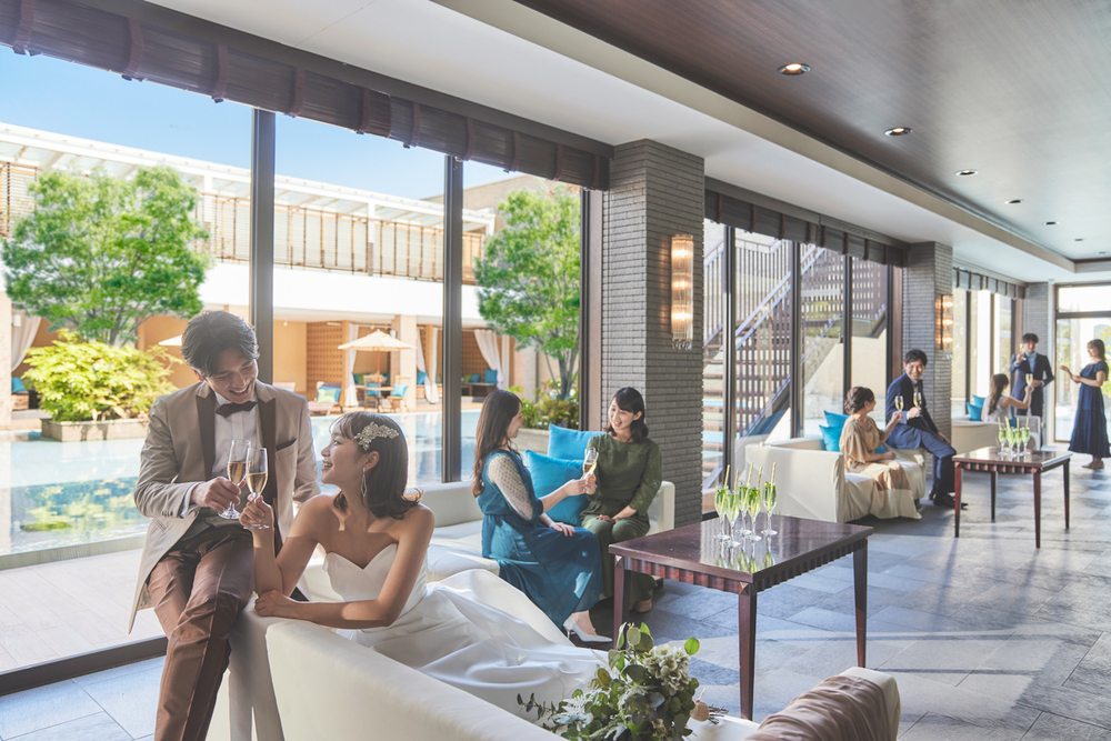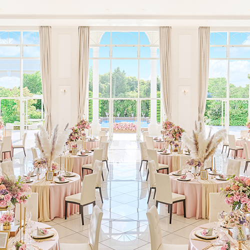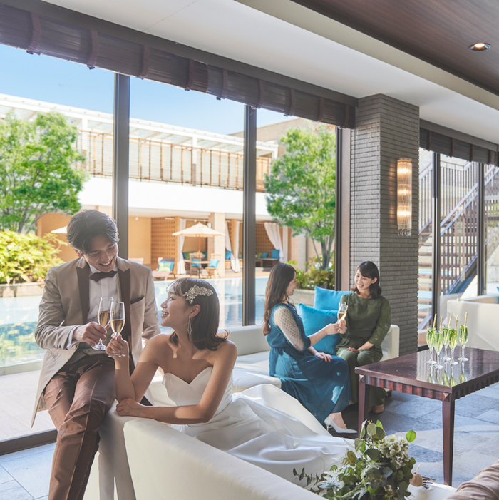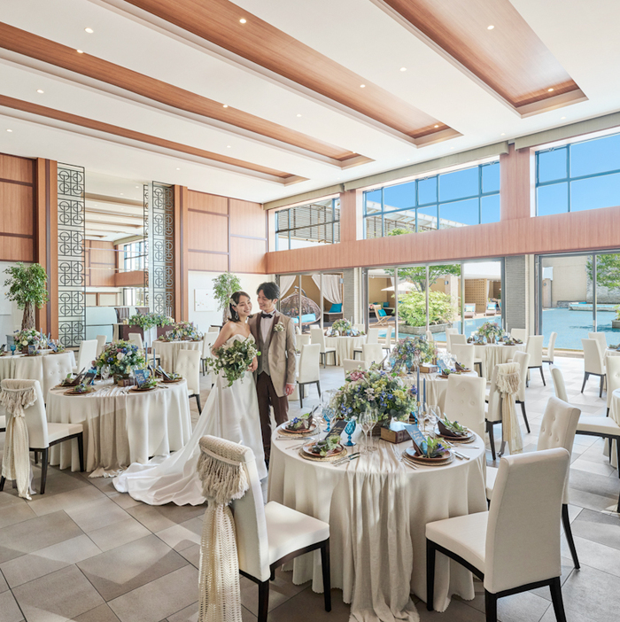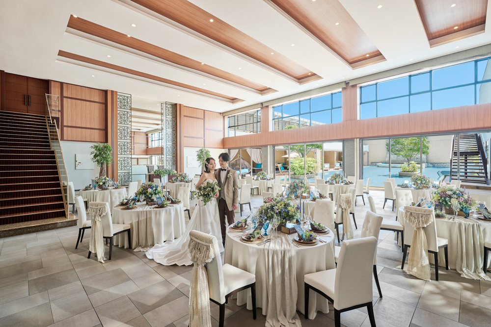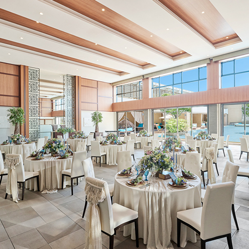 パーティ会場を挟んで、両サイドに広がるダブルガーデン、光に揺れる水面の美しいウォーターテラスが、ハイクラスなリゾートウェディングをより一層印象深いものにしてくれることでしょう。